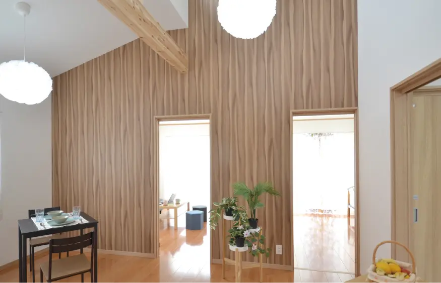 平屋ですがDKの吹き抜け天井が⾼く、採光⽤の⾼窓があり昼間は照明を付けなくても明るいので狭さを感じさせない開放的な作りで気に⼊っています。