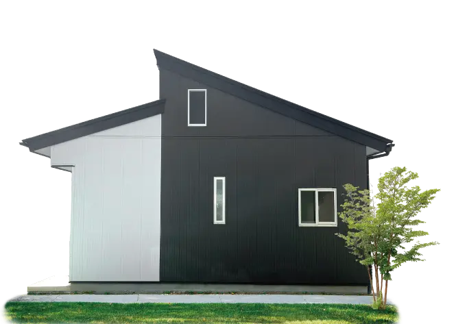 平屋ですが差掛け屋根で⾼いので⾒栄えも良く、他にはあまり⾒かけない屋根形状で気に⼊っています。外壁の⾊やデザインも⾃由に選べた事も良かったです。